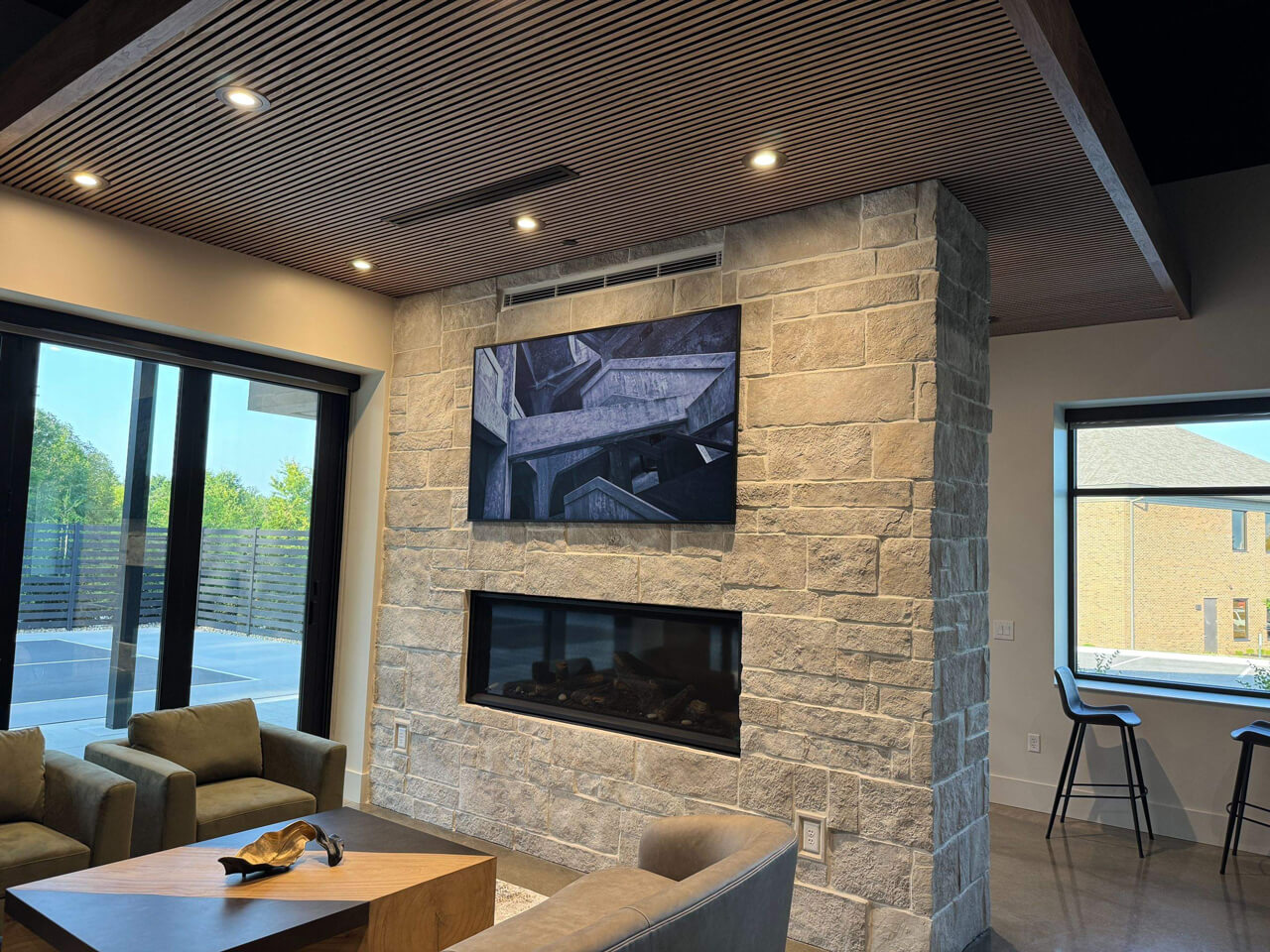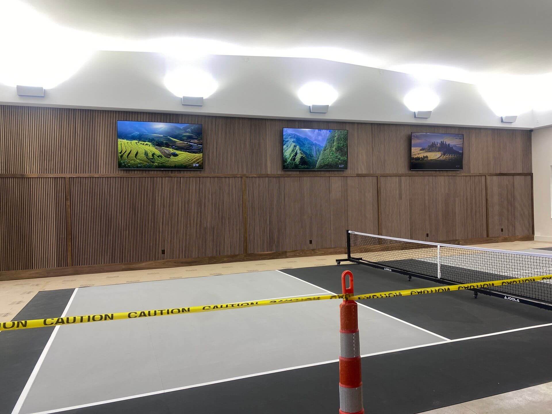 For AV, the space features four mounted commercial TVs — one above the fireplace in the lounge, and three evenly spaced along the pickleball court. Displays can be synced or run independently, supporting events, live sports, or customized digital signage.